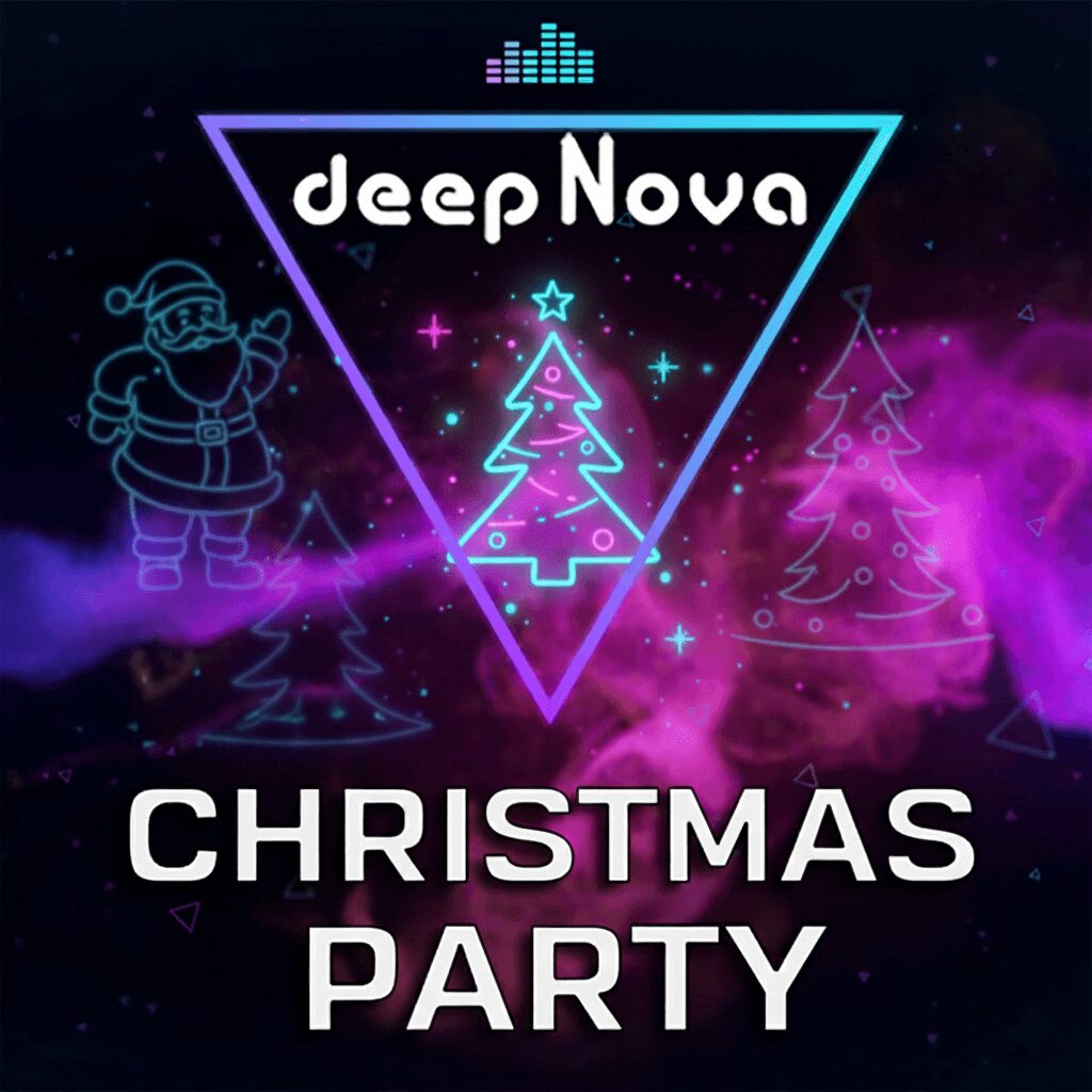 DeepNova Christmas Party image with Santa, Christmas trees, and neon triangle design.
